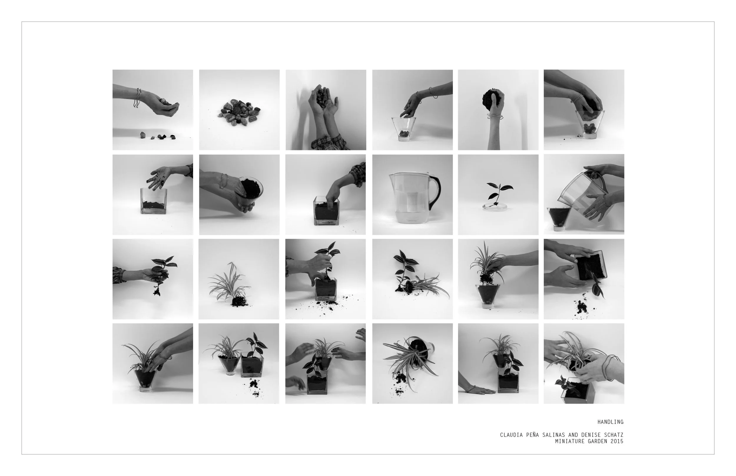 Miniature Garden began as an experiment in 2008 by artist Denise Schatz. With an original focus on collaboration, the project has expanded to include individual artist publications. The name was inspired by an image found in a book about houseplants from the 1970’s: A grid of instructional photographs shows a pair of hands—the hands selecting a container, gathering soil, handling tools, placing the plants into dirt and carefully watering them. Being small and independently contained, the miniature garden is similar to a book where ideas can grow.